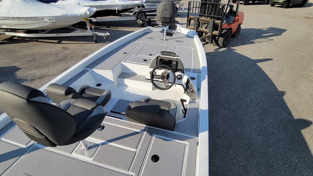 2026 Xpress H18 Bass. 18’ bass boat. White hull & liner. Charcoal Seats. Seadek in grey. Seadek in cockpit.