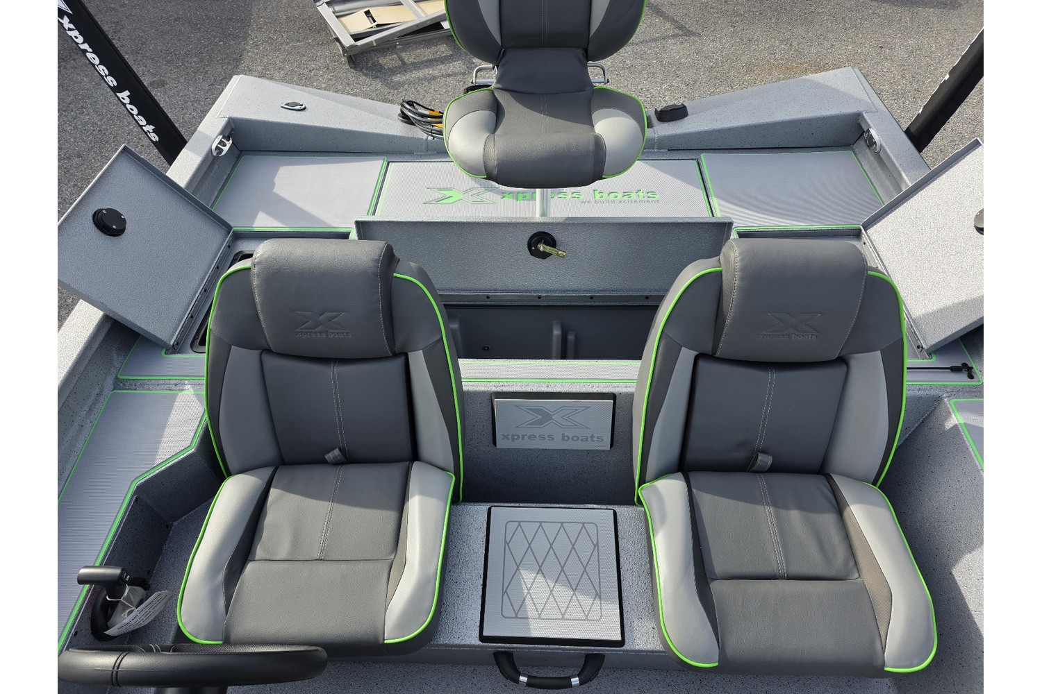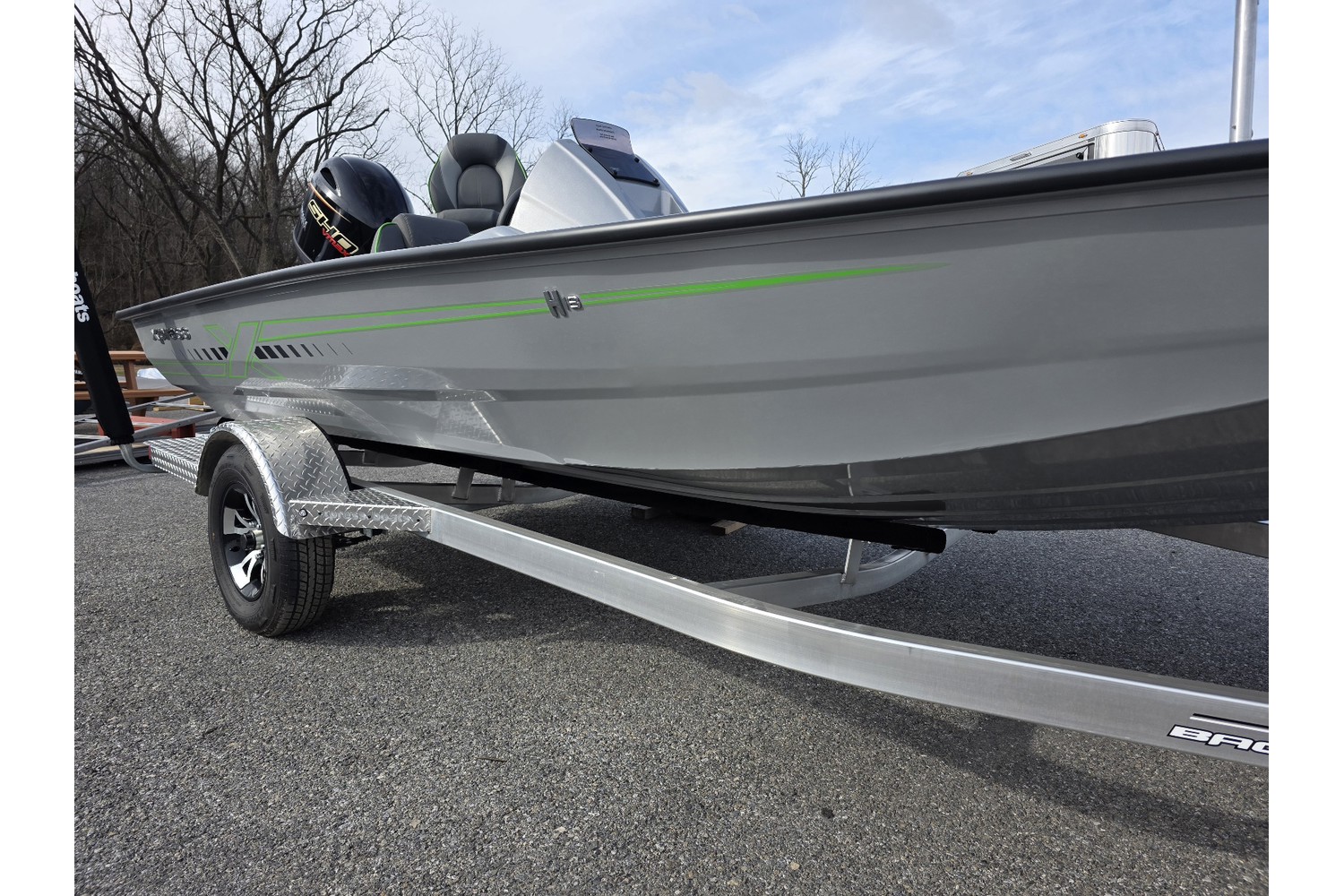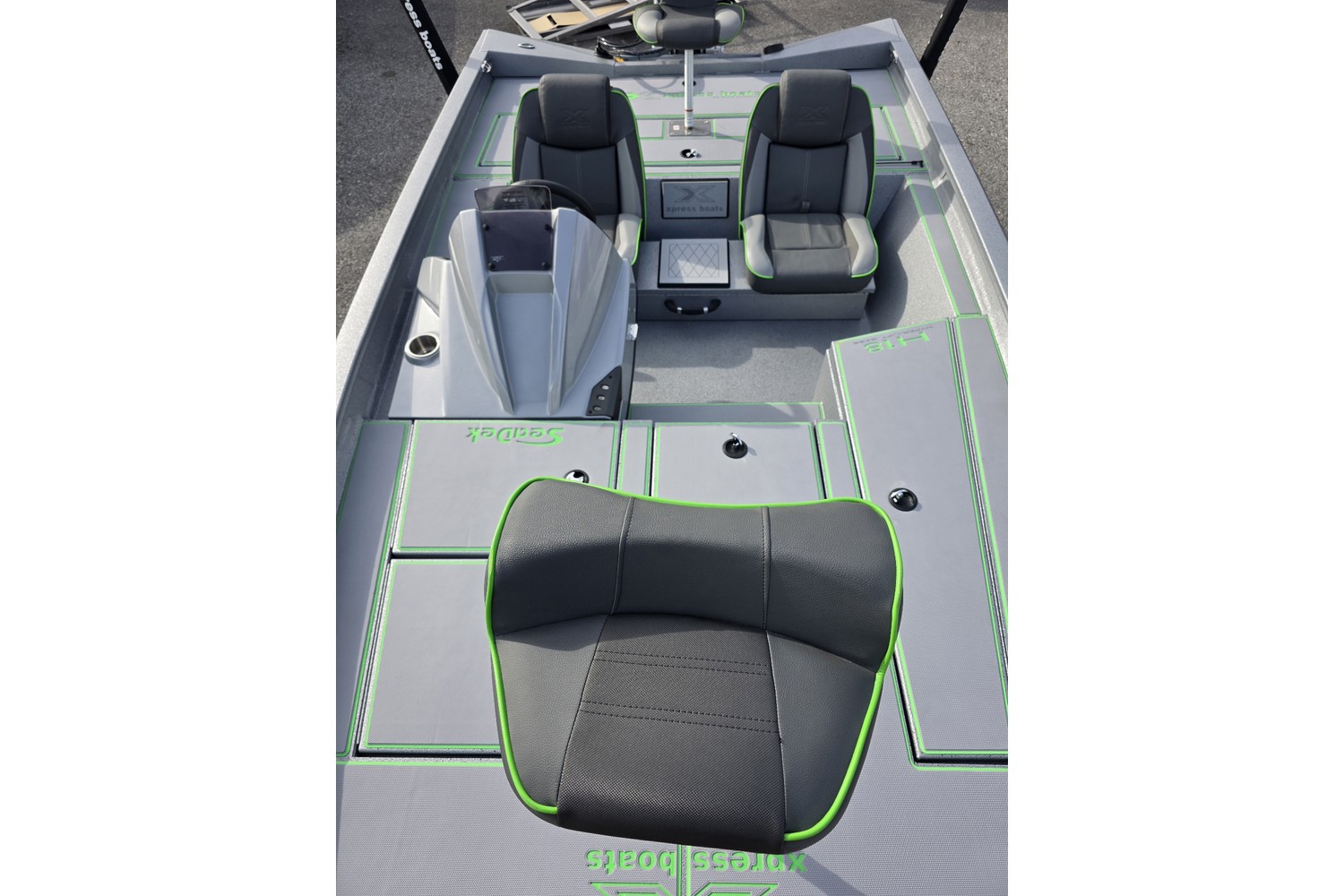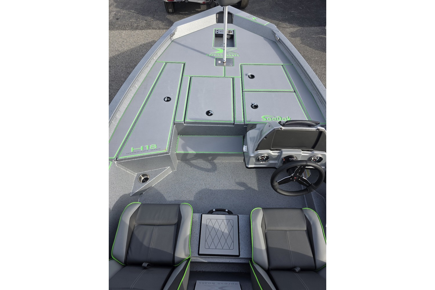2026 Xpress H18 Bass. 18’ bass boat. Silver hull & liner. Appearance package in Lime, Lime Seadek, seat stripes, hull graphics.