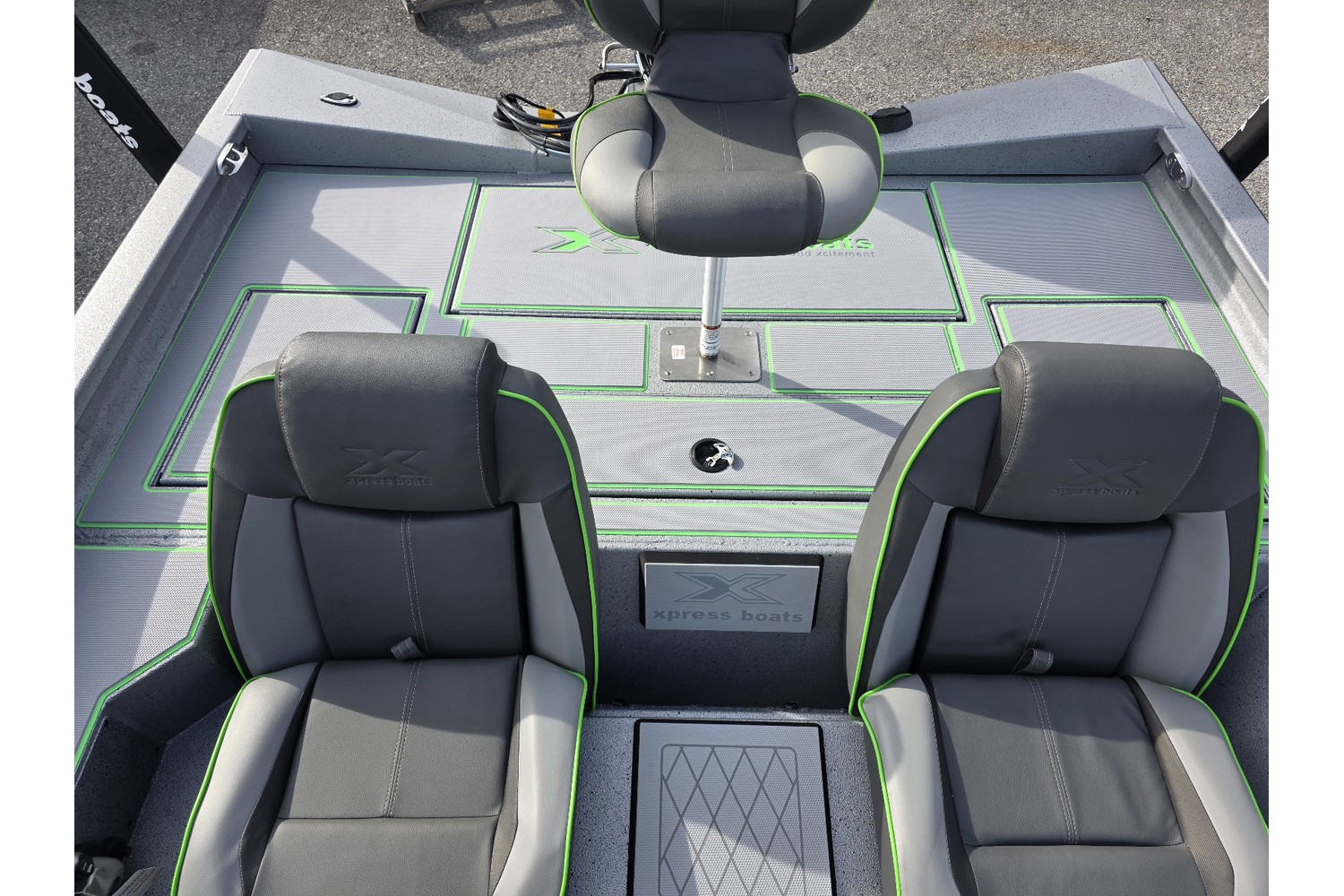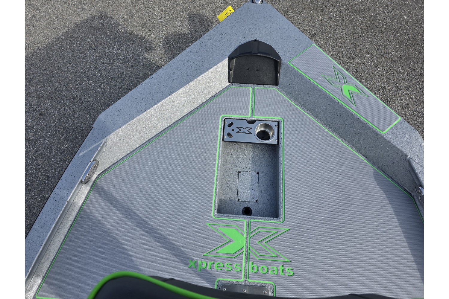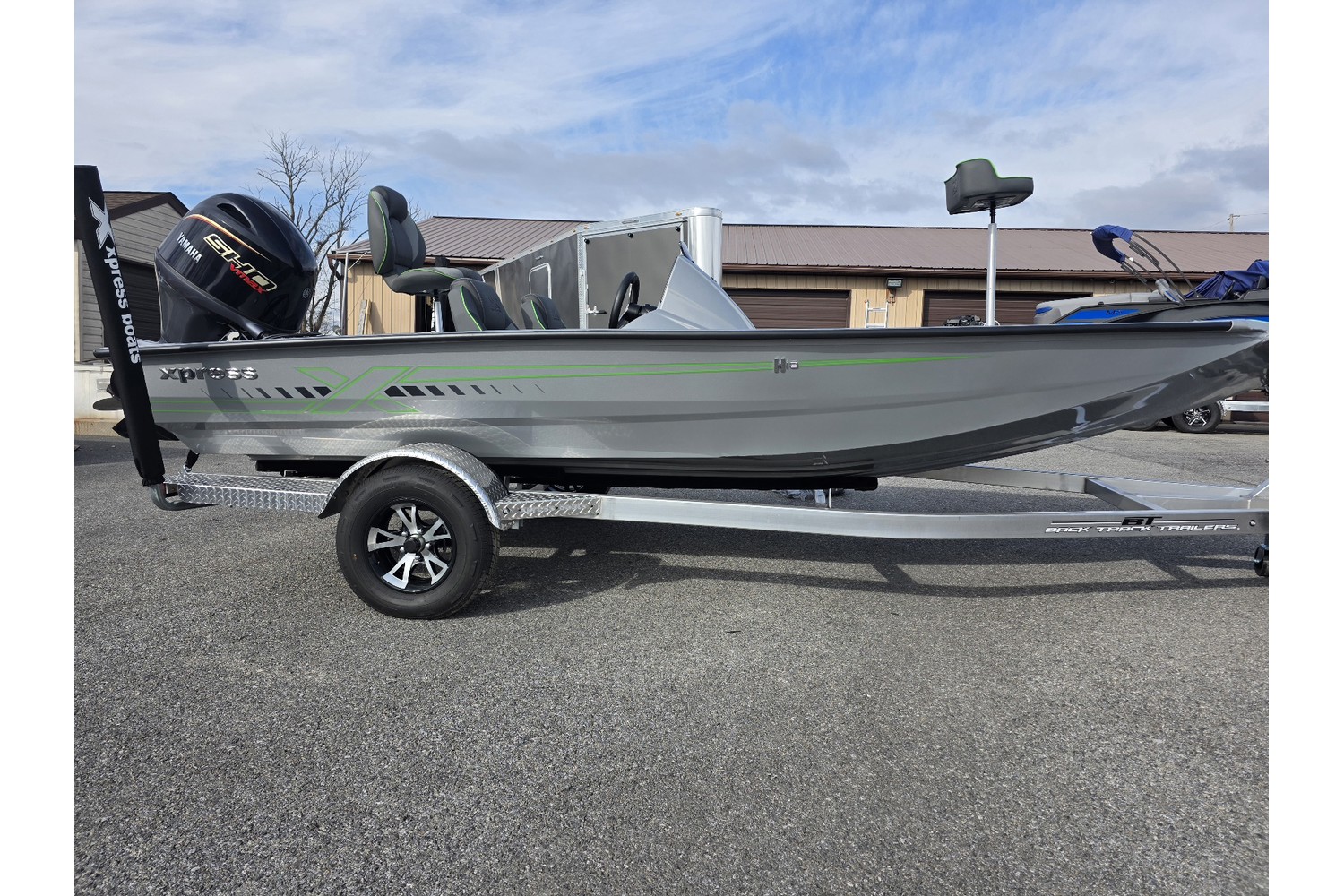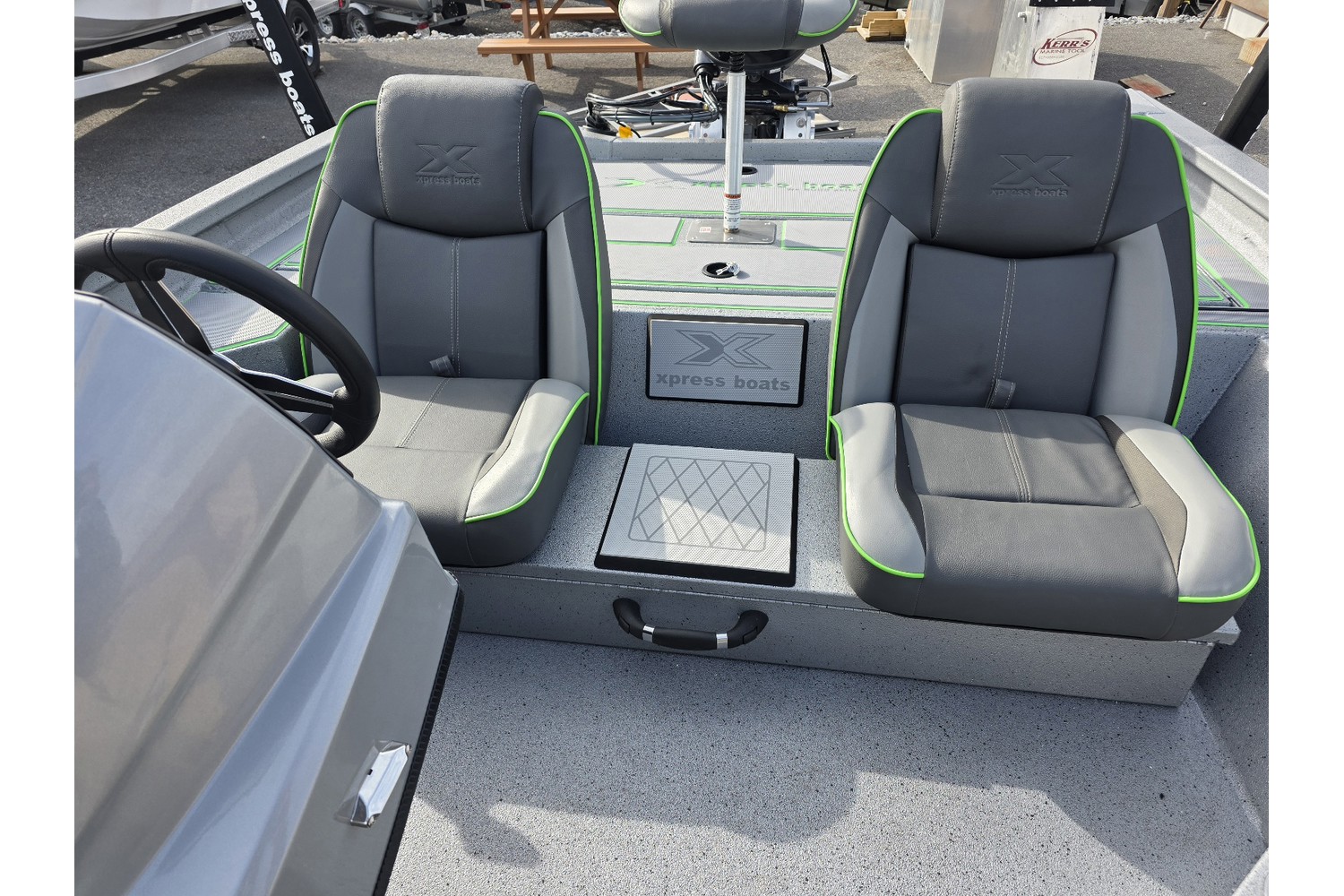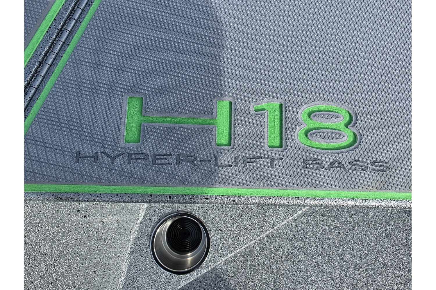 2026 Xpress H18 Bass. 18’ bass boat. Silver hull & liner. Appearance package in Lime, Lime Seadek, seat stripes, hull graphics.