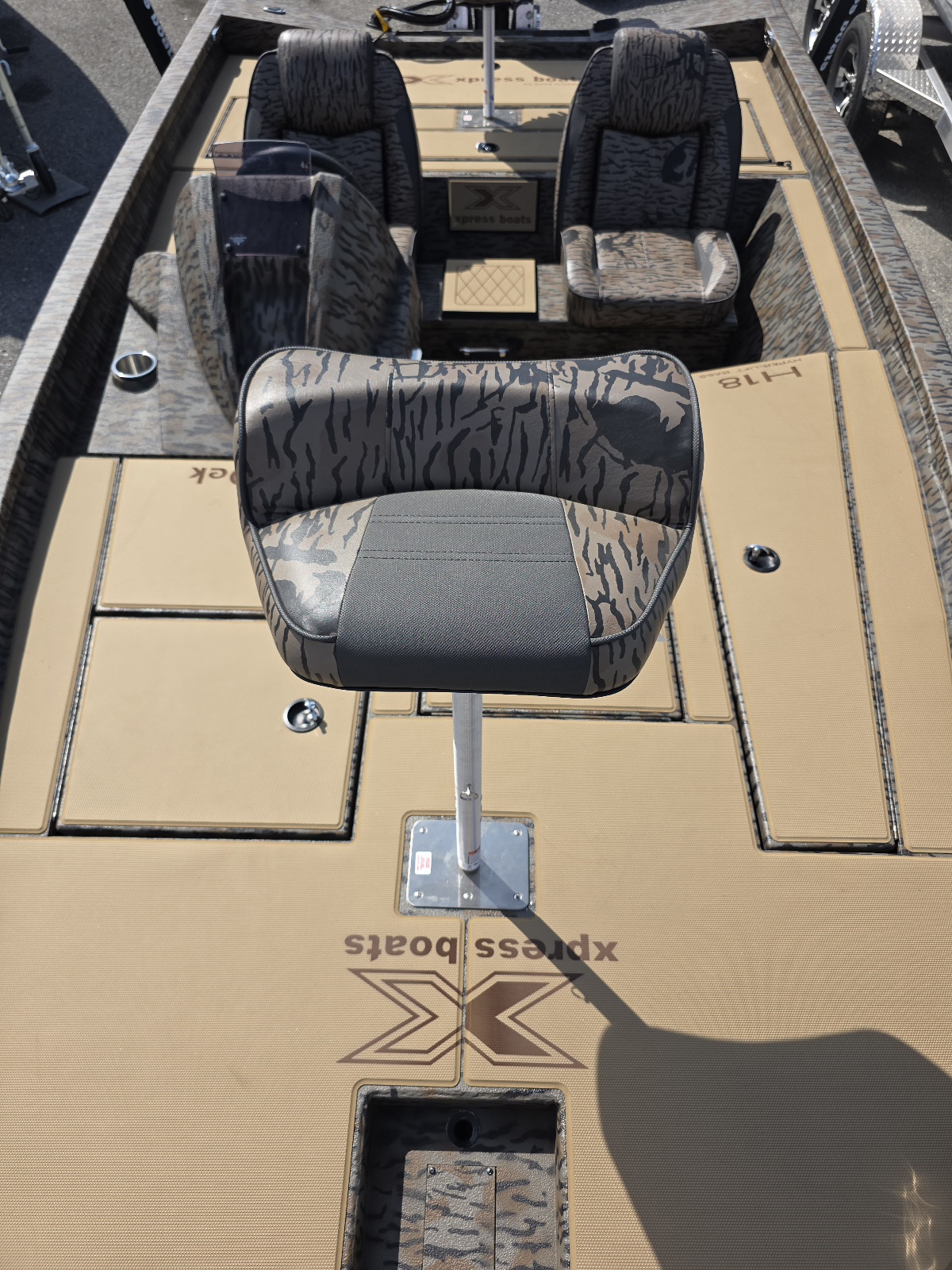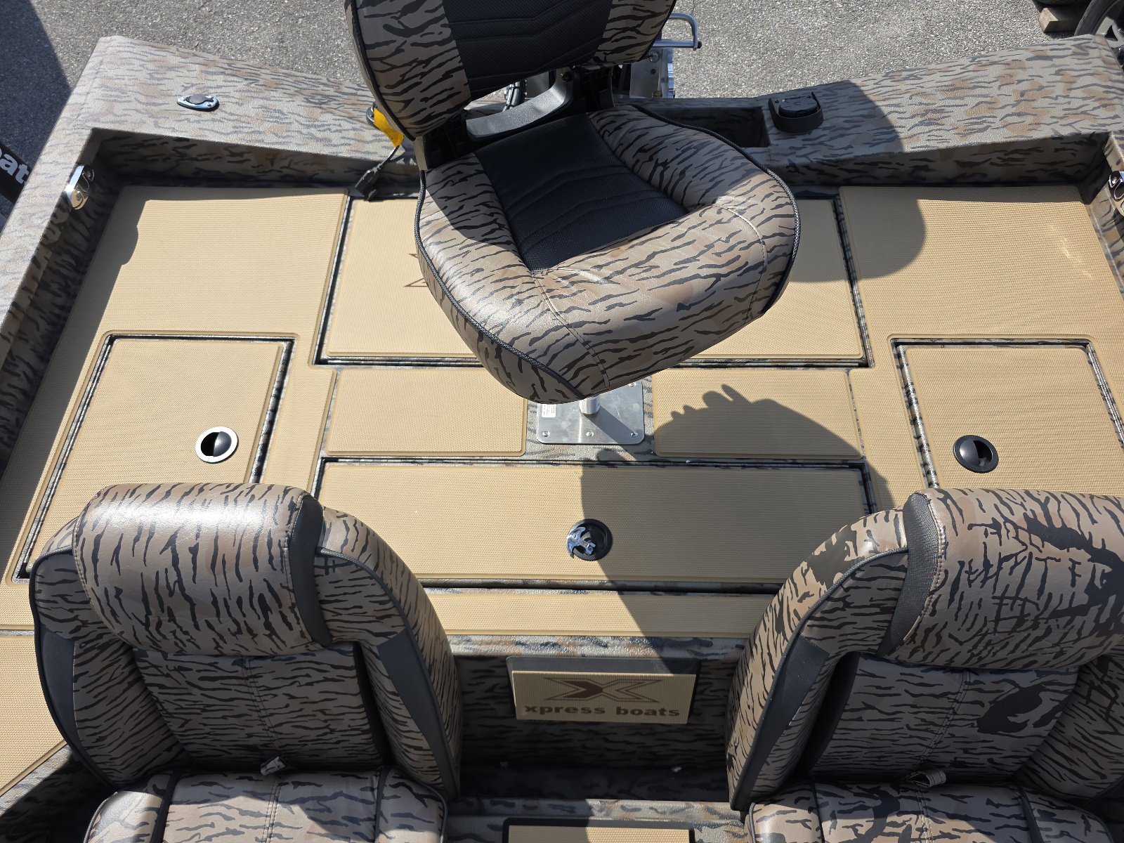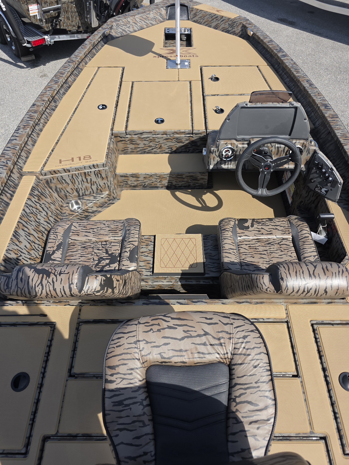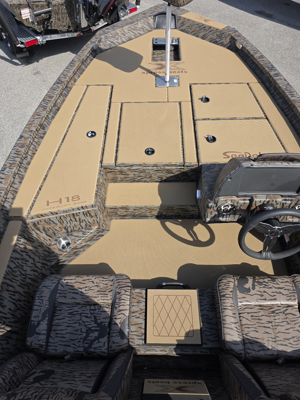 2026 Xpress H18 Bass. 18’ bass boat. Duck boat package, camo paint & camo Seats. Seadek in cappuccino. Seadek in cockpit.