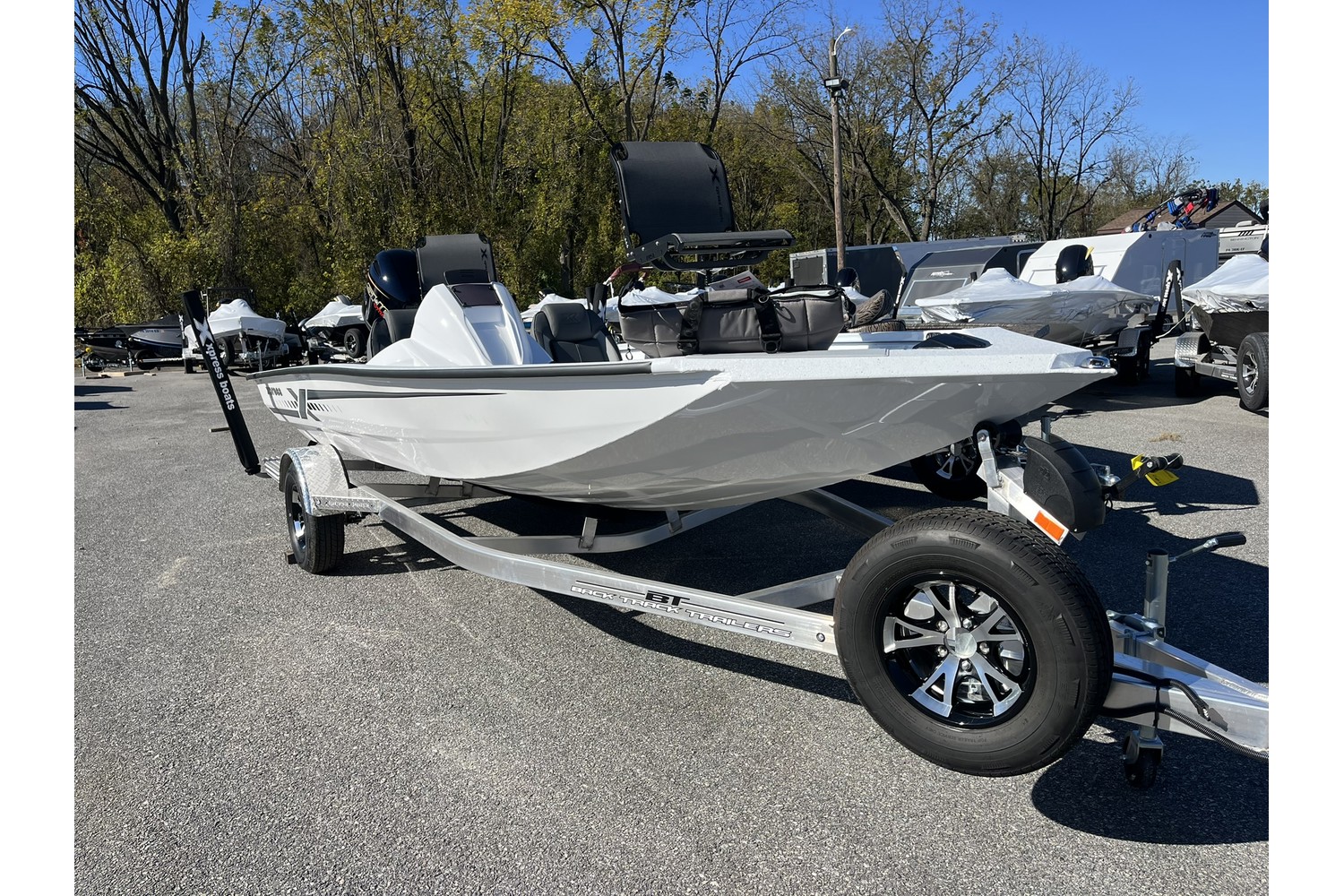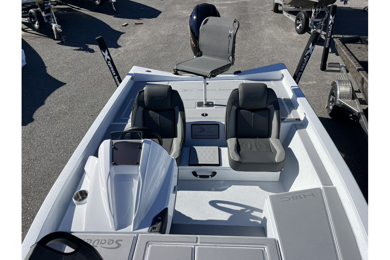2026 Xpress H18 Crappie. 18’ crappie boat. white hull & liner. grey Seats. Seadek in grey.