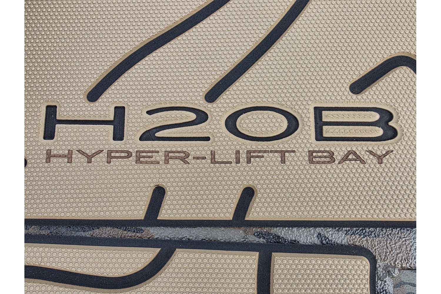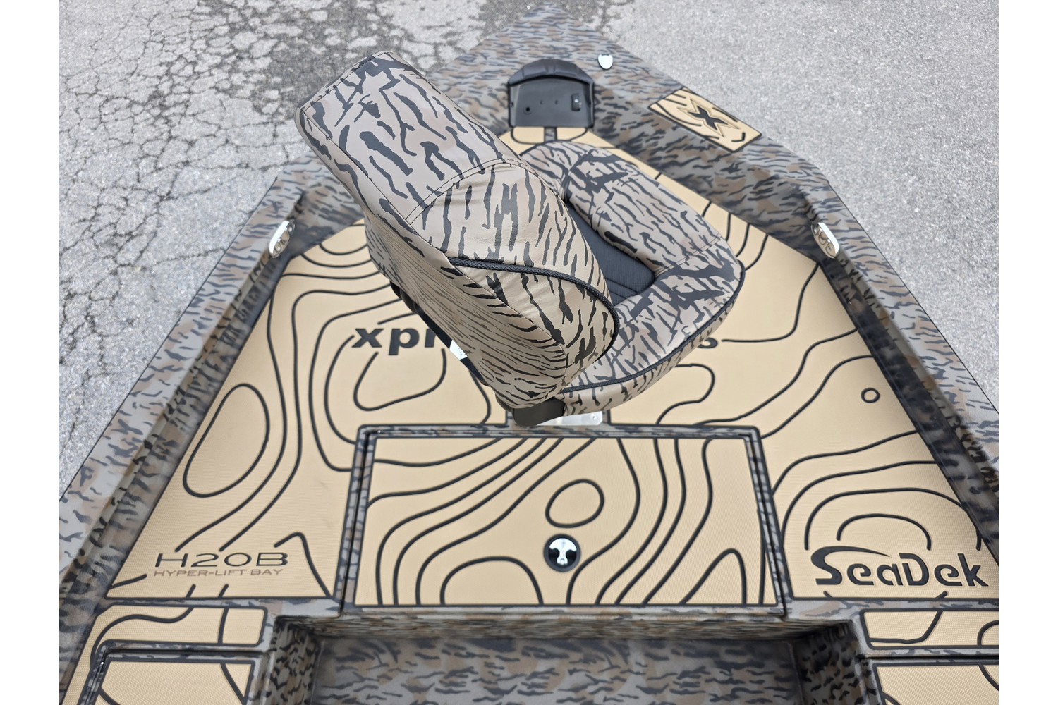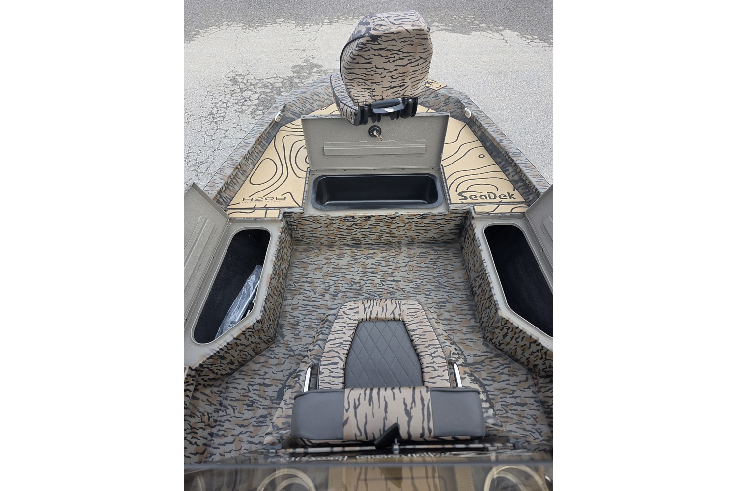 2026 H20B, 20' H Bay Center Console with Hyper Lift Hull. Duck boat package w/ Camo hull & liner, camo seats. Seadek in Cappuccino w/black stripes.