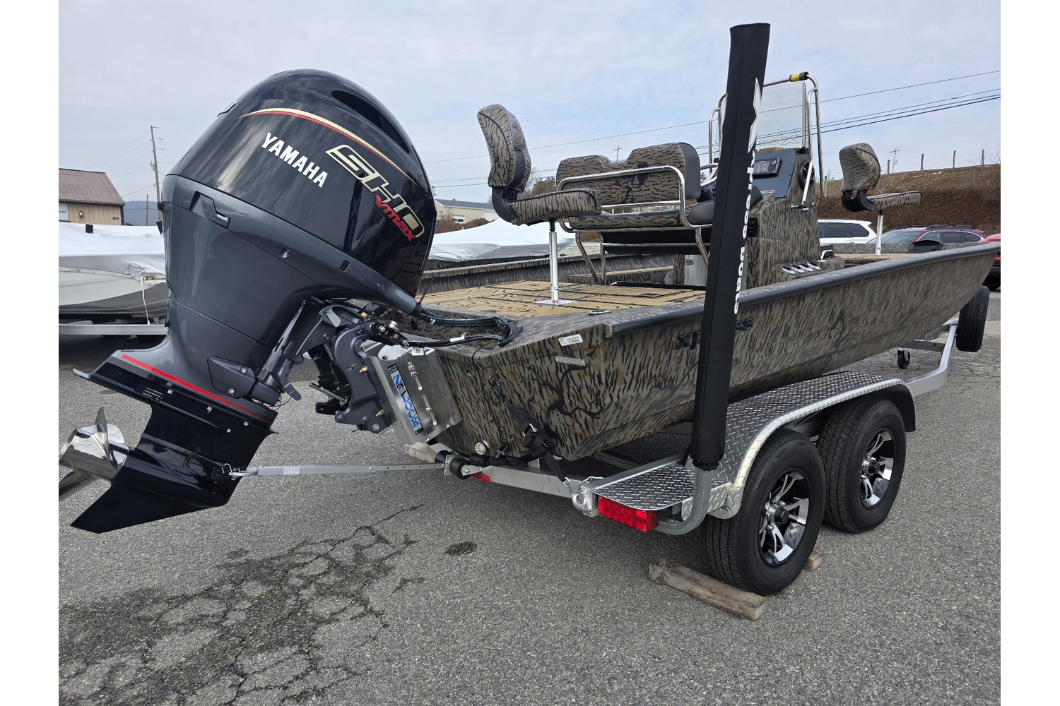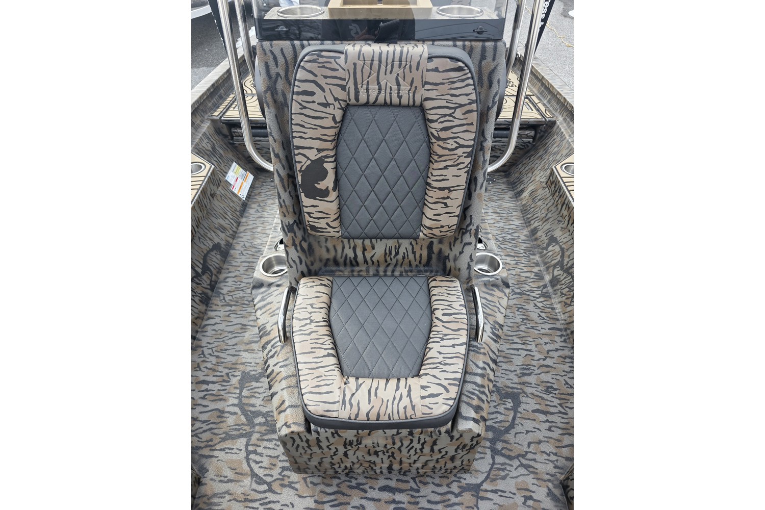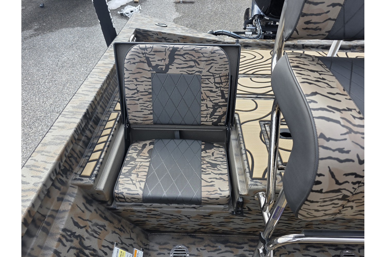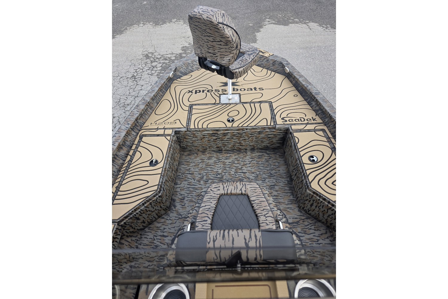 2026 H20B, 20' H Bay Center Console with Hyper Lift Hull. Duck boat package w/ Camo hull & liner, camo seats. Seadek in Cappuccino w/black stripes.