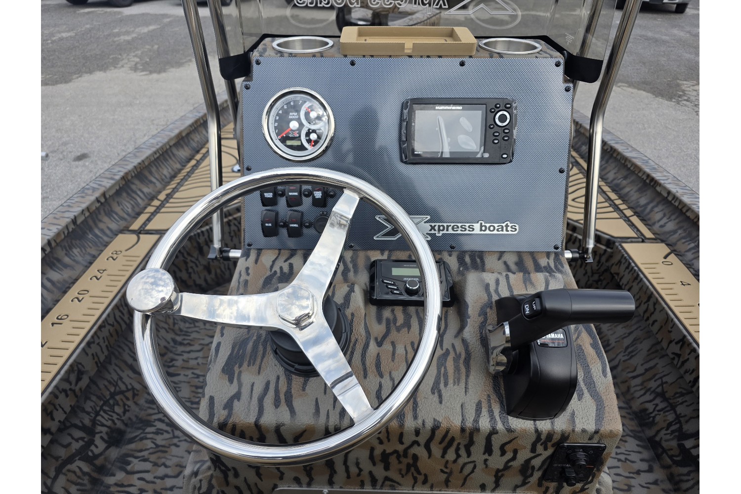 -Redfish package, trim switch at bow, 6 gauge wire upgrade, aluminum wheels, Humminbird Helix 5 fish finder, 2 bank battery charger.