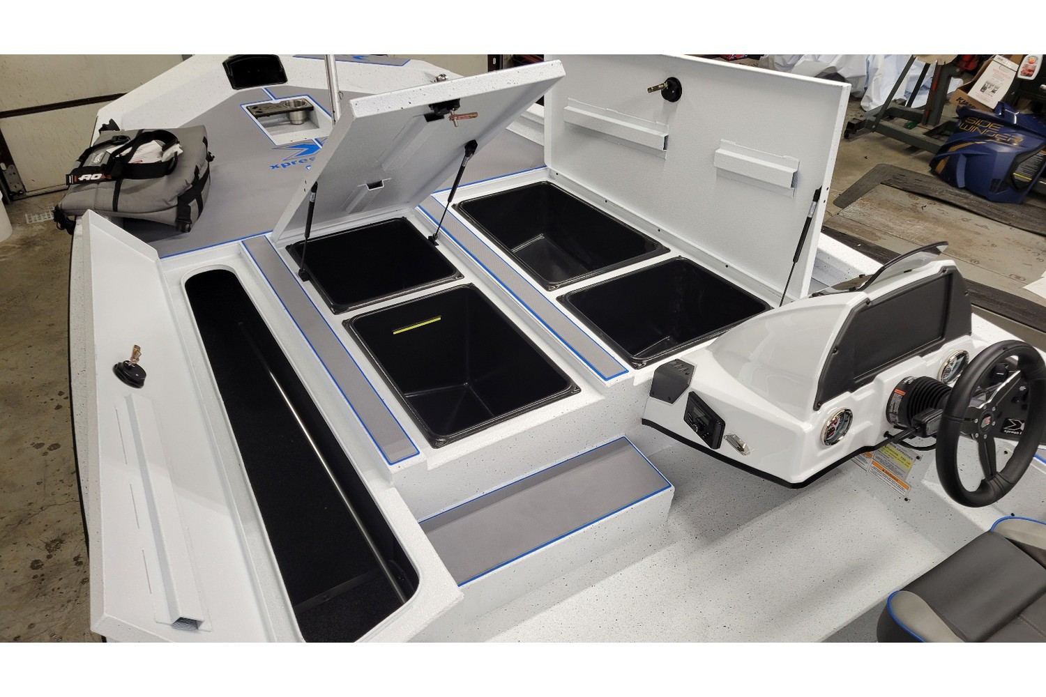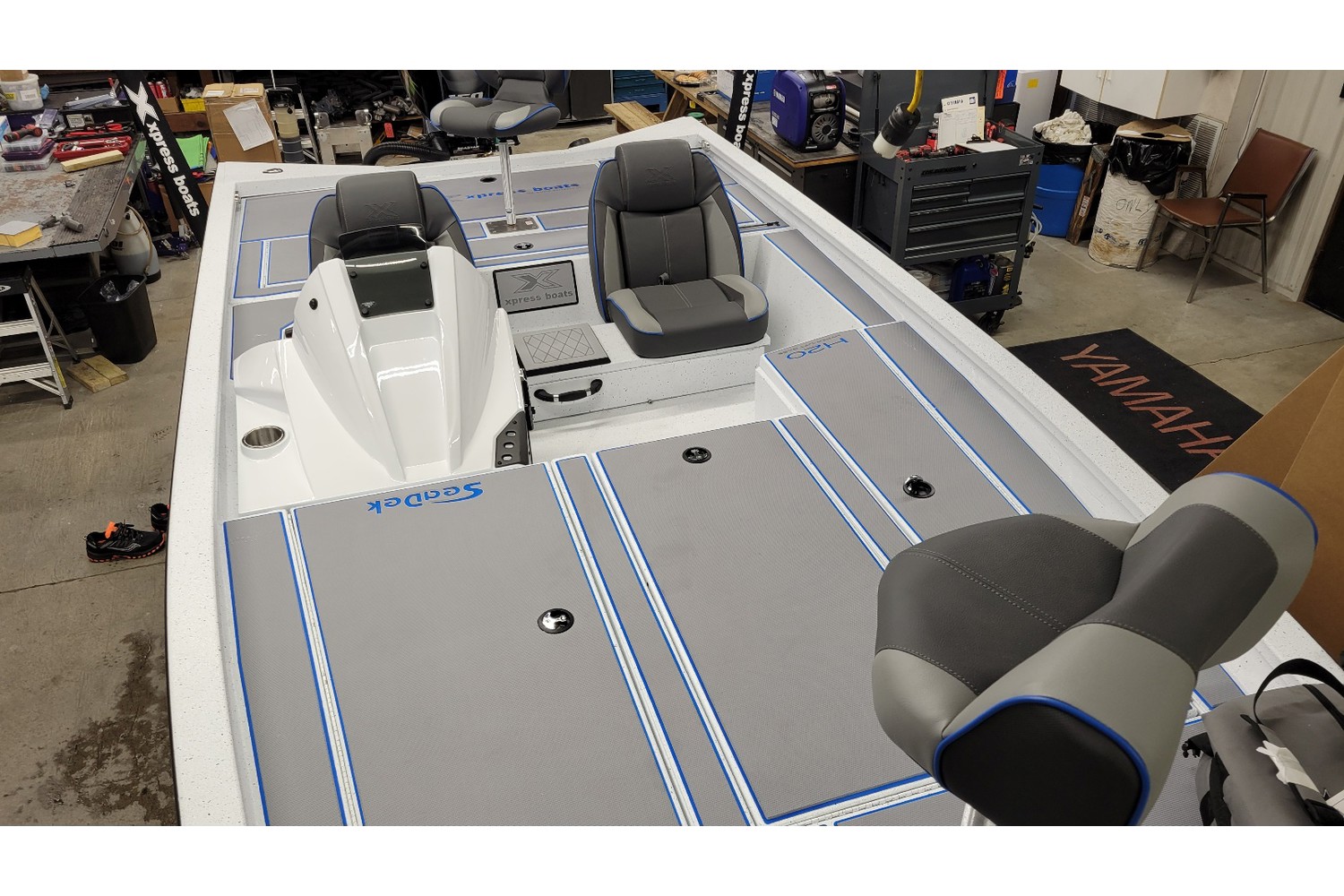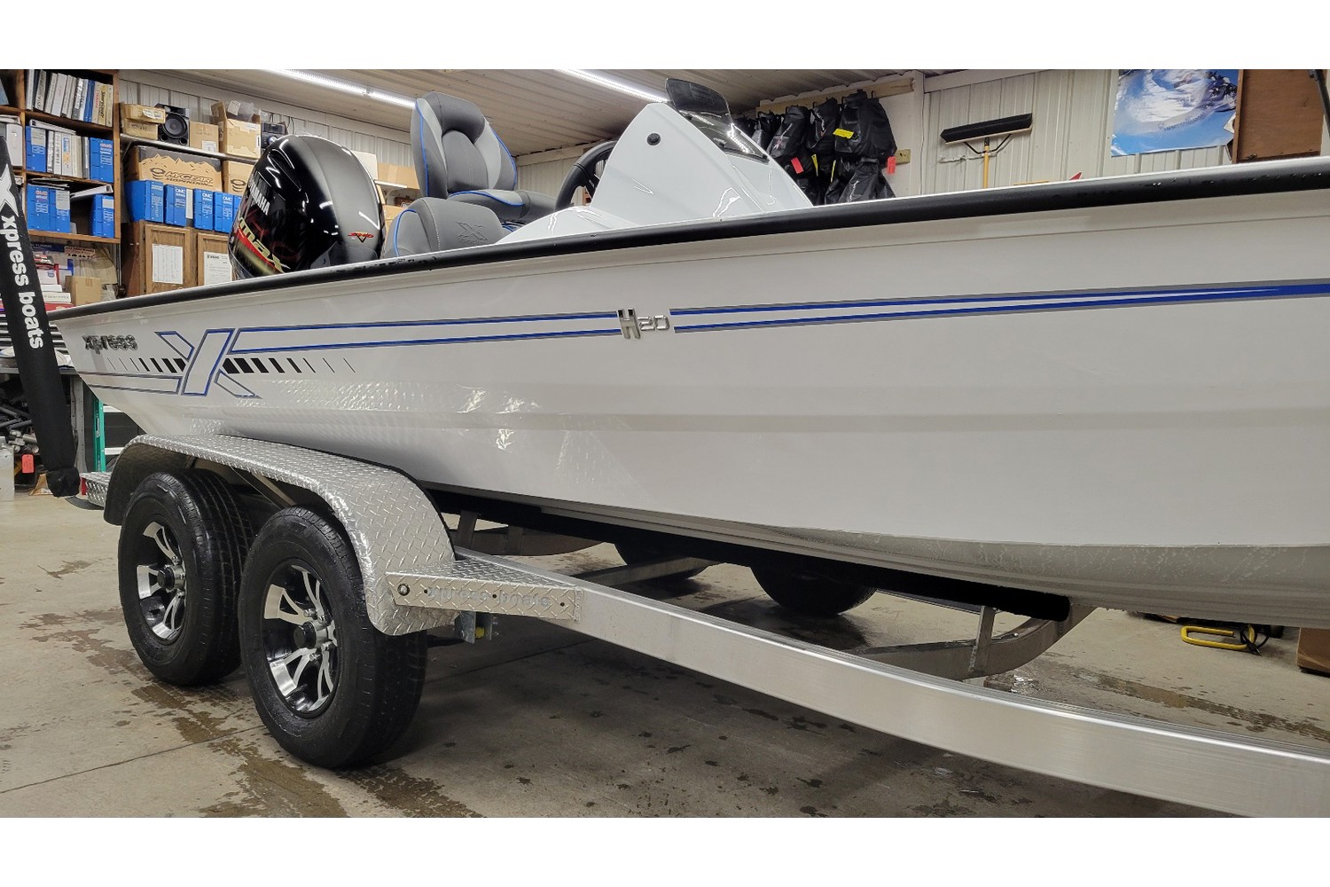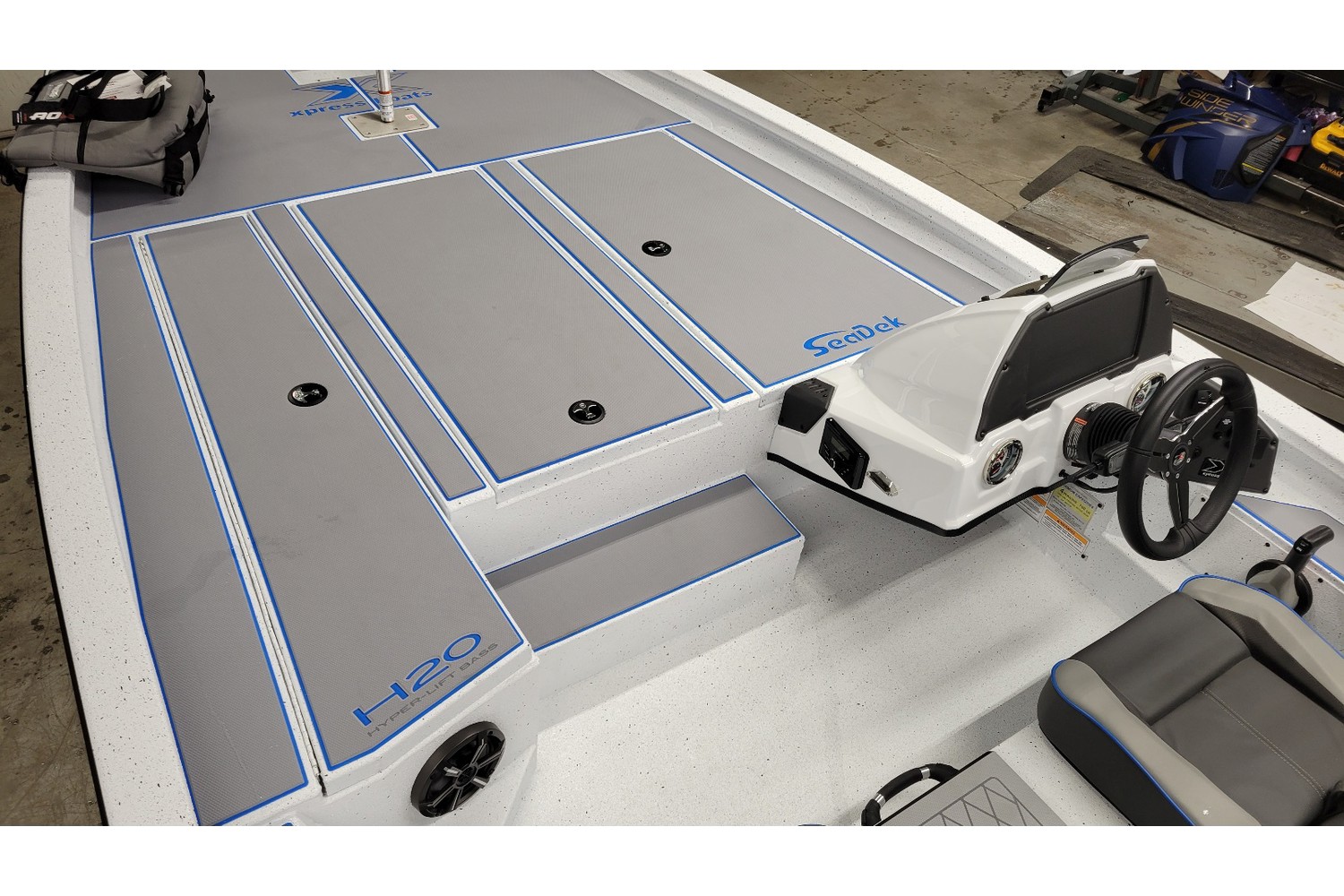 2026 Xpress H20 Bass. 20’ bass boat w/ hyperlift hull. White hull & liner. Blue appearance package, blue Seadek ,seat stripes, hull graphics.
