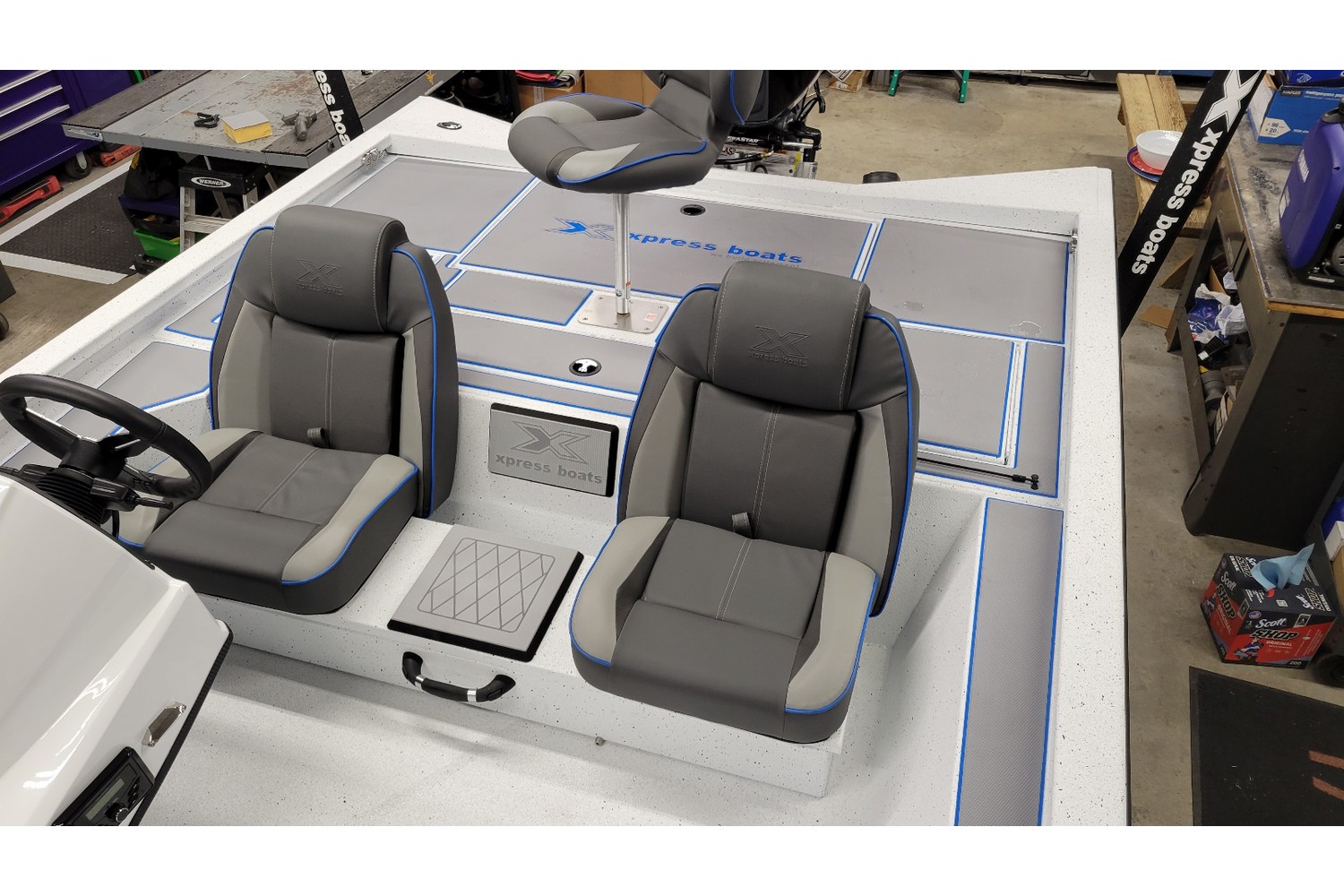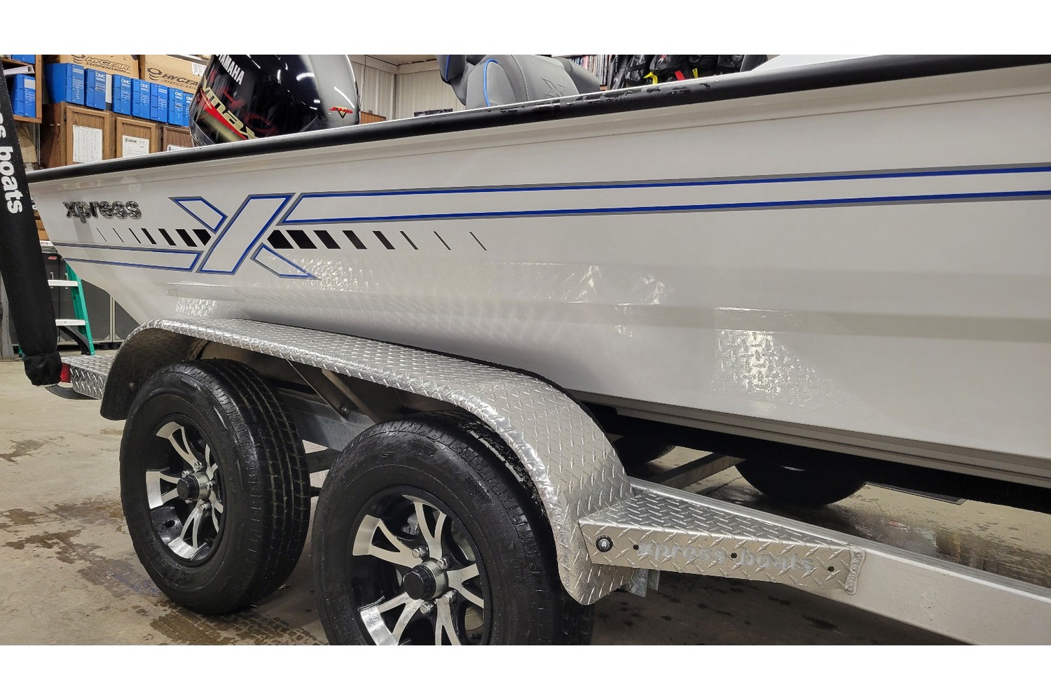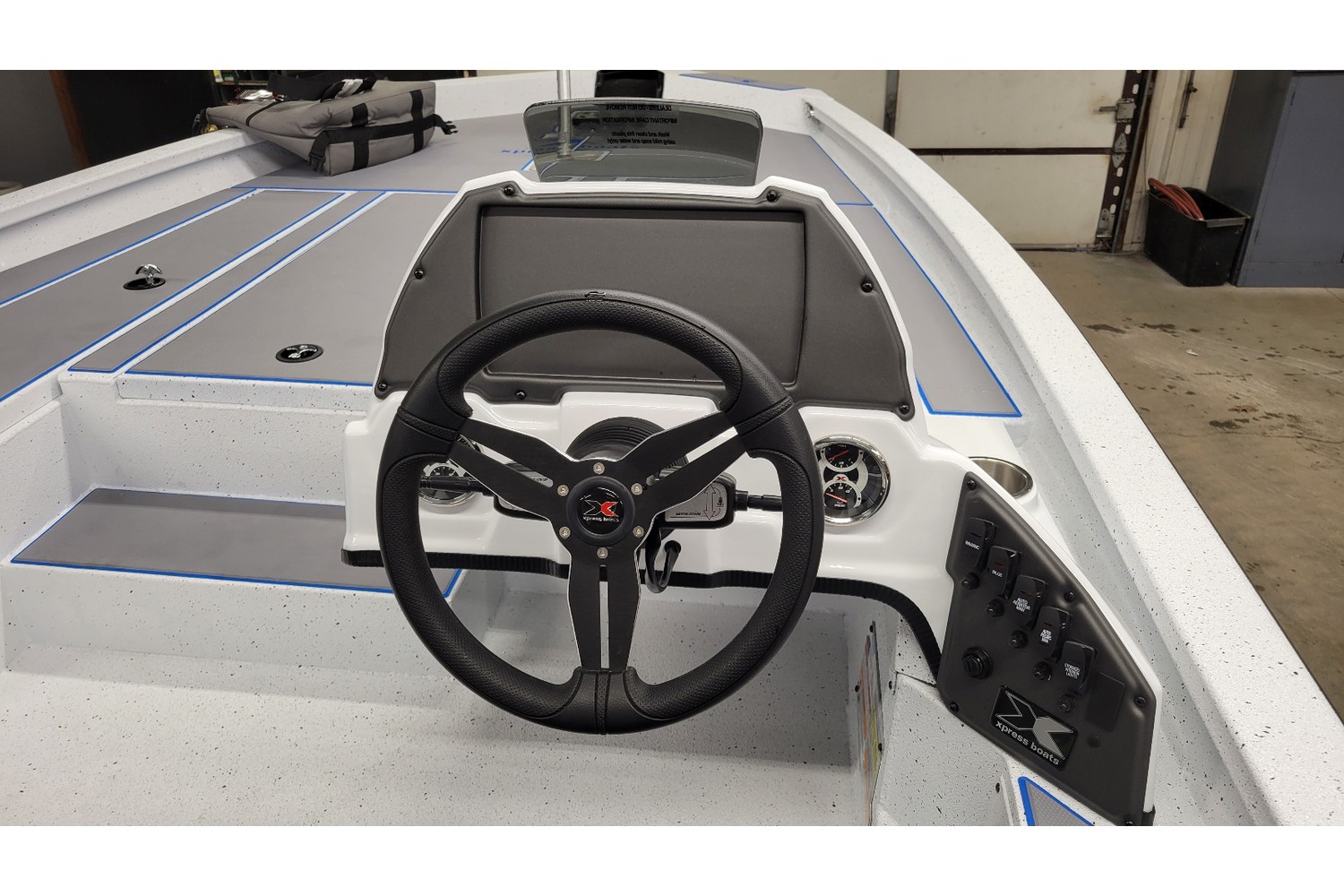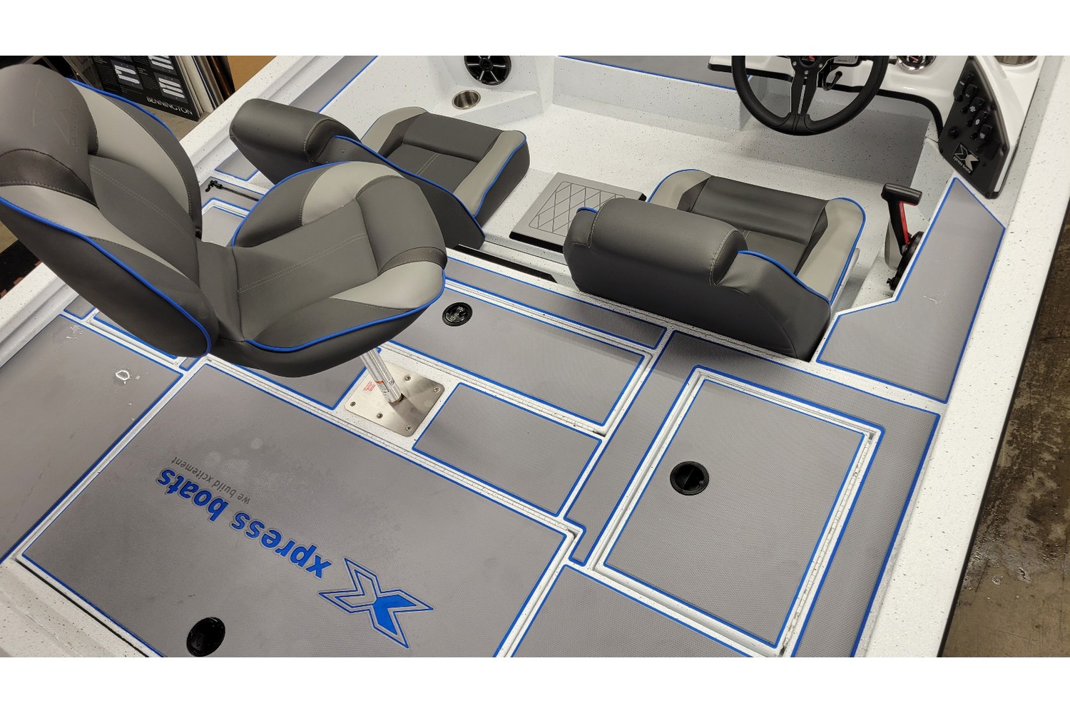 2026 Xpress H20 Bass. 20’ bass boat w/ hyperlift hull. White hull & liner. Blue appearance package, blue Seadek ,seat stripes, hull graphics.