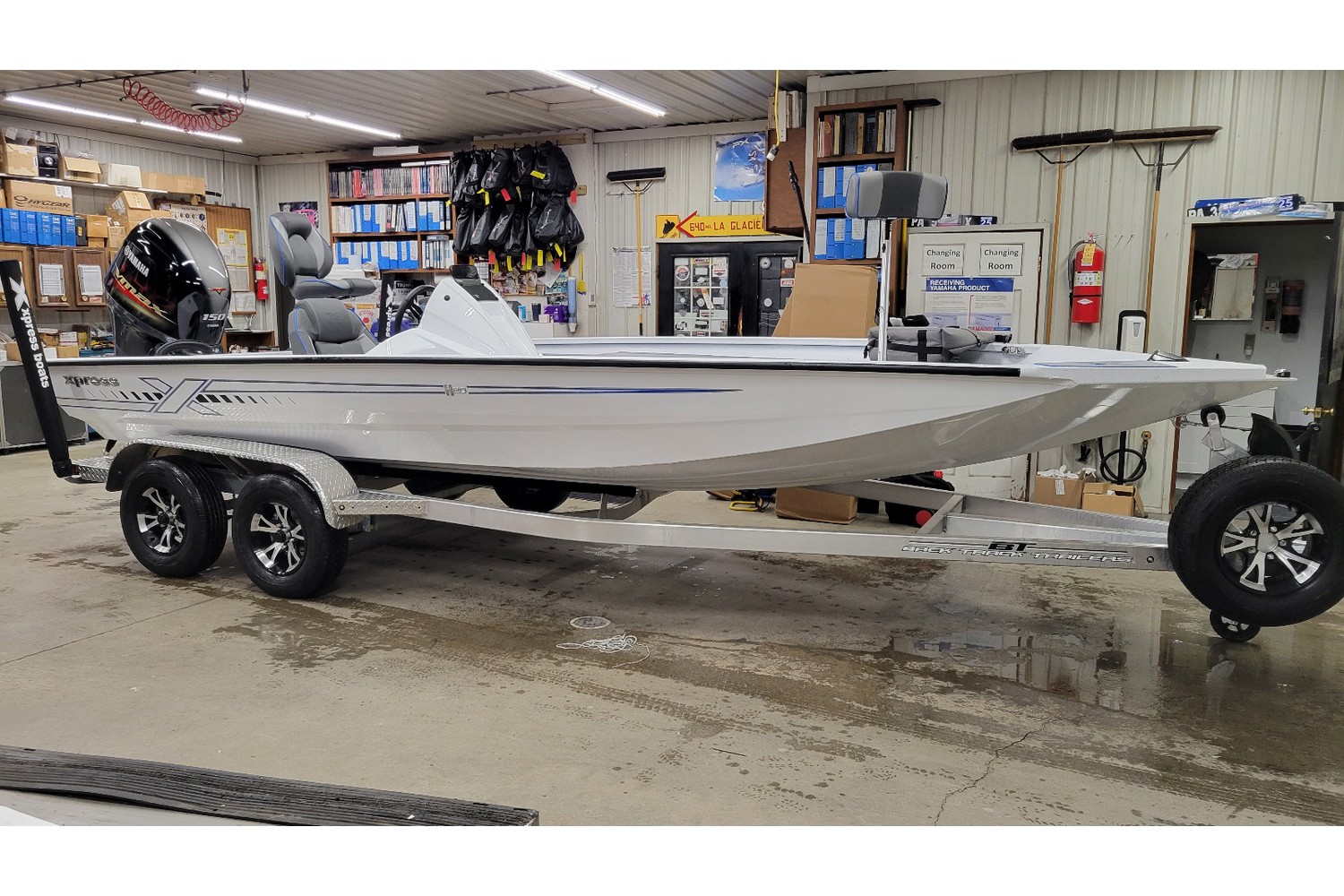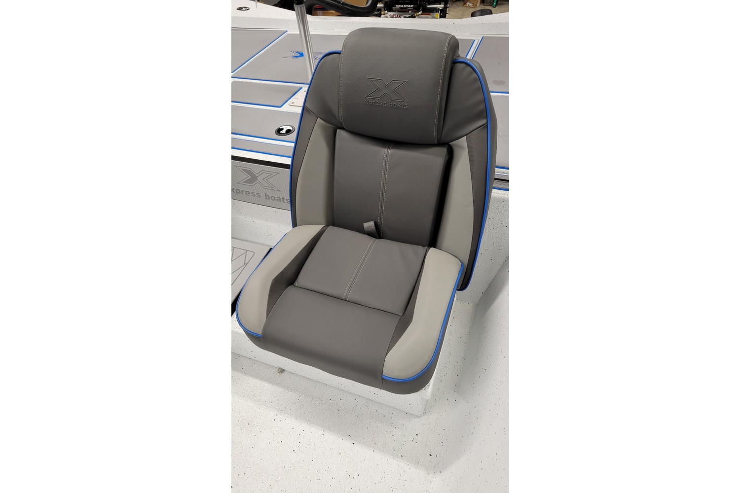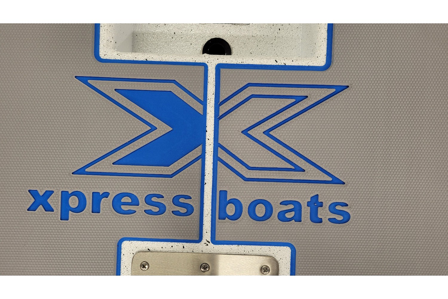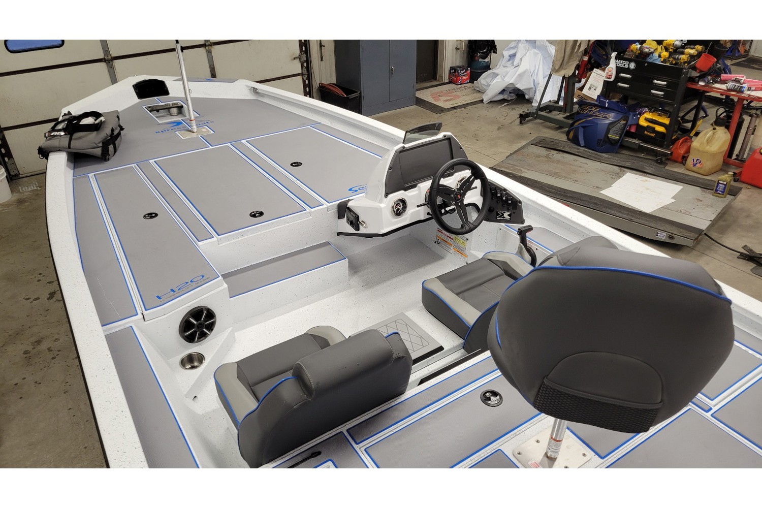2026 Xpress H20 Bass. 20’ bass boat w/ hyperlift hull. White hull & liner. Blue appearance package, blue Seadek ,seat stripes, hull graphics.