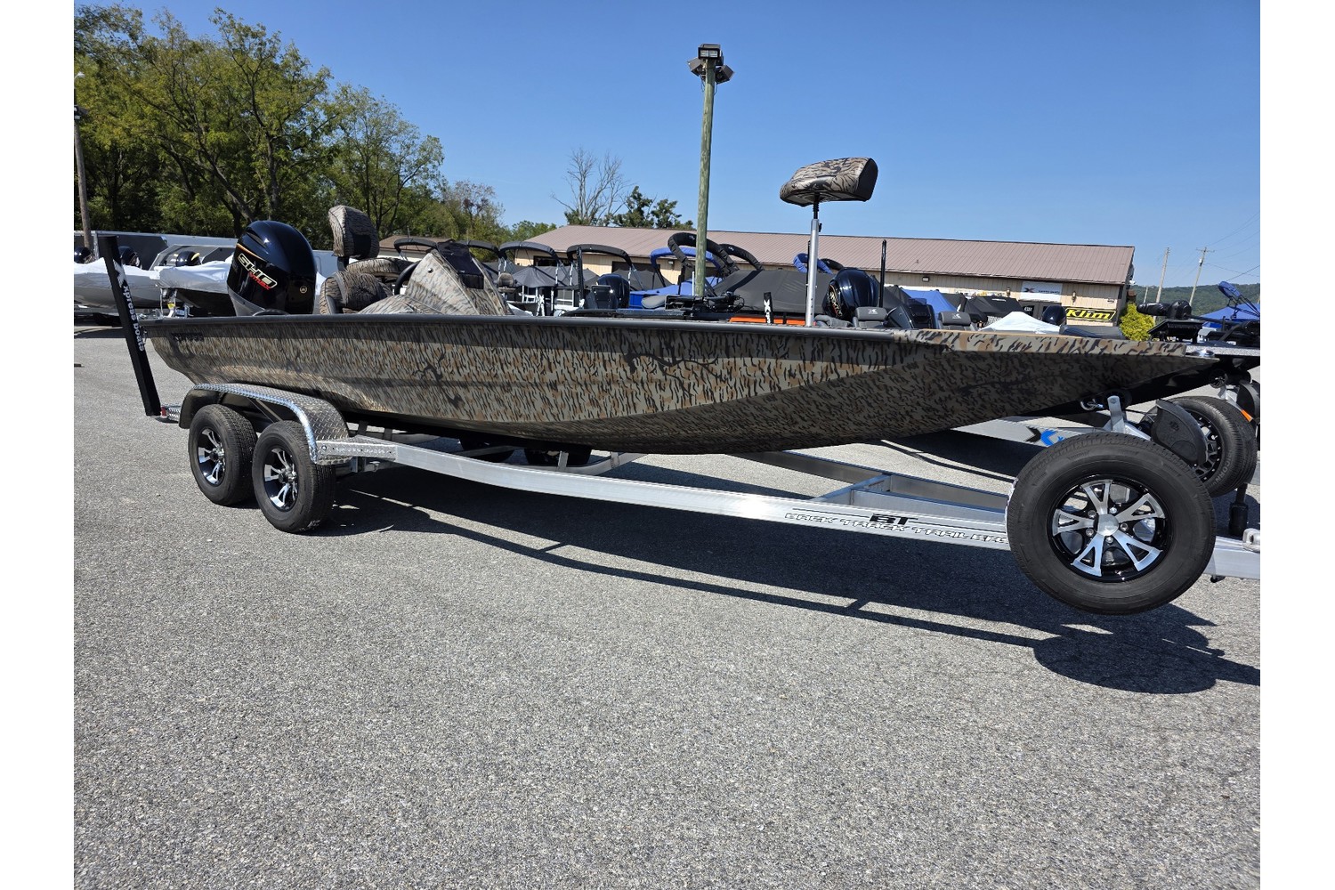 -Aluminum tandem axle trailer, Aluminum wheels, brakes both axles, aluminum spare & mount, lighted logo trailer step.